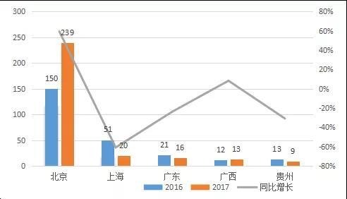地方电视剧进口量较大的省(区、市)主要为北京、上海、广东、广西和贵州,电视剧进口部数分别为 239部、20部、16部、13部和9部。其中,北京电视剧进口部数最多,占到全国79.14%,较2016年(150部)同比增长59.33%(见图10)。