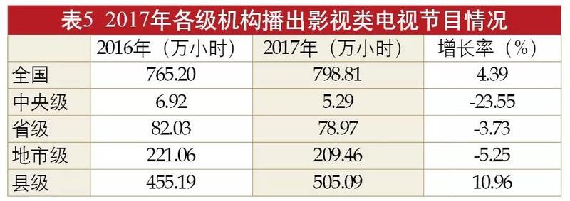 其中,中央级广播电视机构播出影视类电视节目时间5.29万小时,比2016年(6.92万小时)下降23.55%;省级播出影视类电视节目时间78.97万小时,同比下降3.73%;地市级播出209.46万小时,同比下降5.25%;县级播出505.09万小时,同比增加10.96%(见表5)。