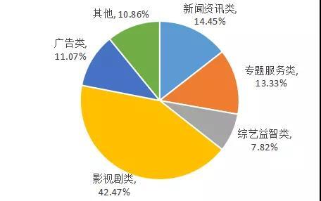 2017年,影视类电视节目播出时间为798.81万小时,比2016年(765.20万小时)增加33.61万小时,同比增长4.39%;影视类电视节目播出时间占全国公共电视节目播出总时间的42.47%(见图8),比2016年(42.69%)下降0.22个百分点。