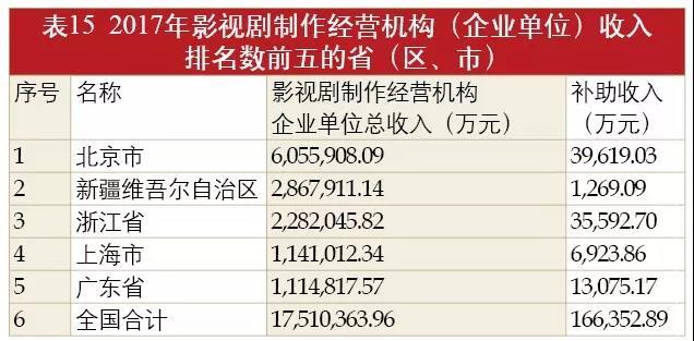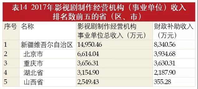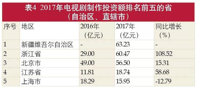 2017年,电视剧制作投资额排名前五位的省(区、市)分别是:新疆(63.23亿元),浙江(60.47亿元),北京(56.50亿元),江苏(18.74亿元)和上海(15.95亿元)。其中,新疆电视剧制作投资额为63.23亿元,跃居全国榜首(见表4)。