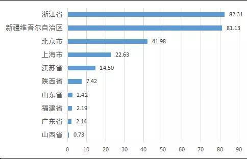 2017年,各省(区、市)电视剧销售额排名中,浙江以82.31亿元位列第一,新疆地区以1.18亿元的微弱差距排名第二位,北京、上海、江苏分别以41.98亿元、22.63亿元和14.50亿元排名第三至第五位(见图7)。