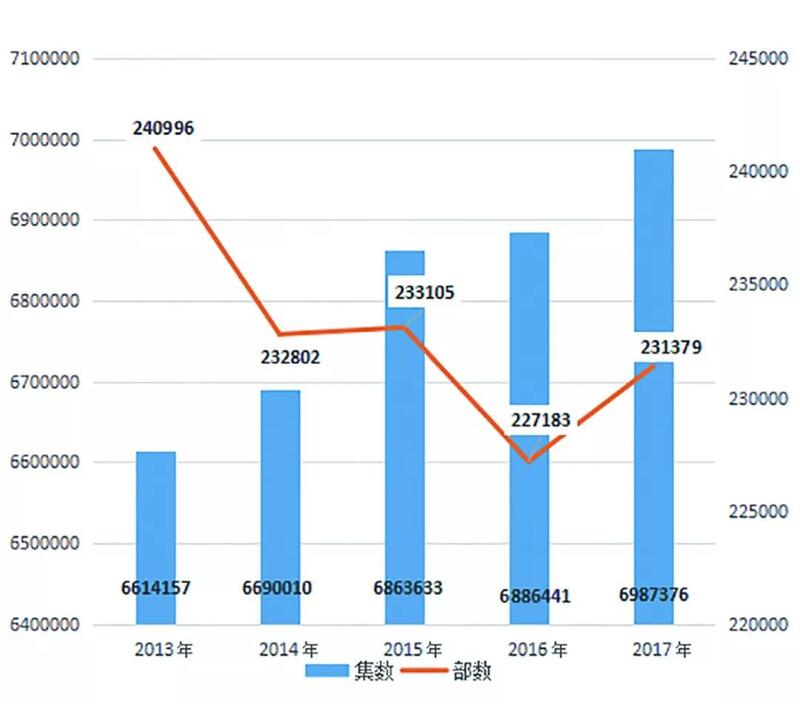 2017年,全国共播出电视剧23.14万部、698.74万集,相比2016年(22.72万部)增长1.85%(见表6)。其中,播出进口电视剧1473部、4.03万集;播出国产剧22.99万部、694.71万集。2013~2017年,电视剧播出部数略有下降,播出集数保持增长(见图9)。