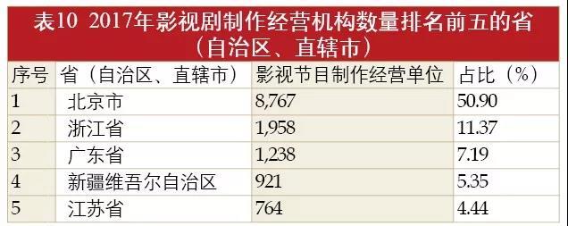 2017年,纳入统计范围的影视节目制作经营机构(报告中的影视节目制作经营机构不含广播电视台和网络视听服务机构)总数为17223家。其中,机构数量位列前三的分别是北京市(8767家)、浙江省(1958家)和广东省(1238家),分别占比50.90%、11.37%和7.19%(见表10)。