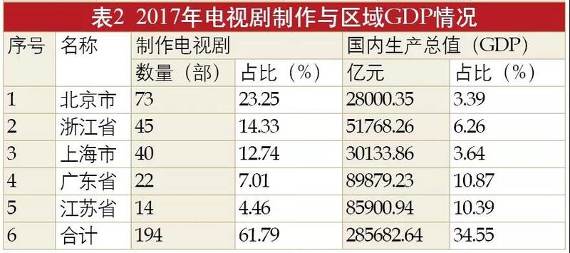 2017年,全国超过半数电视剧制作量集中在北京、浙江、上海、广东和江苏。其中,北京制作电视剧73部,占比23.25%;浙江制作45部,占比14.33%;上海市制作40部,占比12.74%;广东制作22部,占比7.01%;江苏制作14部,占比4.46%(见表2)。