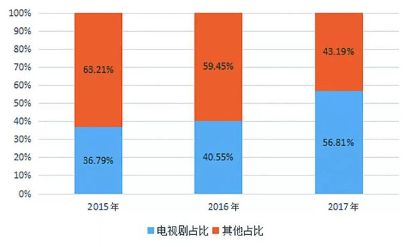 2017年电视剧制作投资额242.26亿元,比2016年(128.53亿元)增加113.73亿元,同比增长88.49%(见图3);电视剧制作投资额占电视节目制作投资总额(426.46亿元)的56.81%,比2016年占比(40.55%)增加了16.26个百分点(见图4)。