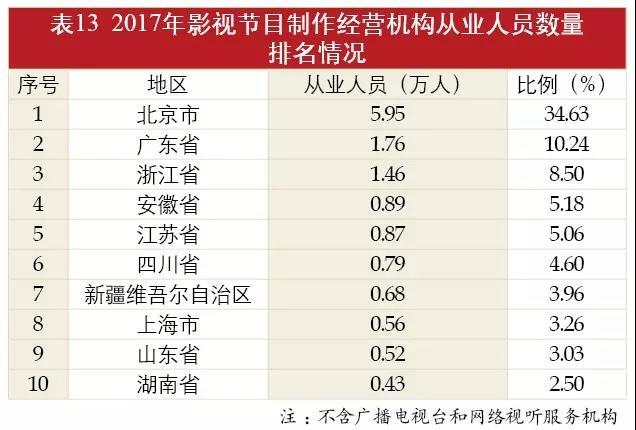 东部地区影视节目制作人才供需两旺。北京、广东和浙江影视节目制作机构从业人员数量分别为5.95万人、1.76万人和1.46万人,占据全国的53.38%(见表13)。