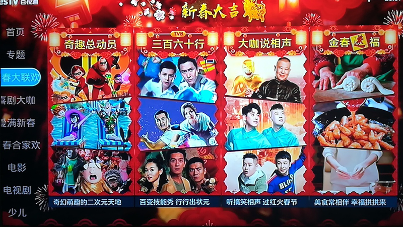 从整体的EPG界面看,菜单栏位于电视主界面左侧,以瀑布流的的方式呈现。首页占据三分之一的是影视会员包的广告,其他的则由动漫、体育、影视剧等栏目构成,内容比较庞杂。因正值春节期间,电视界面主色调为中国红,还推出了平时没有的“爱满新春”、“新春合家欢”、“新春大联欢”等和春节关联度比较大的栏目。在一定程度上契合了用户的过节心理。