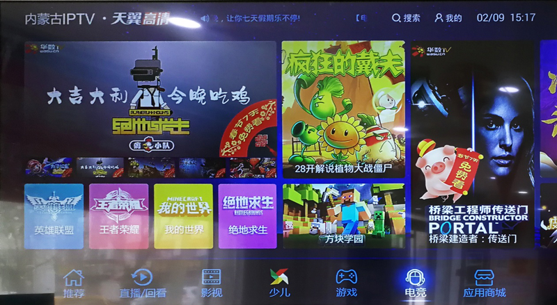 让小编眼前一亮的是,电信IPTV还专门设立了电竞专区,在该专区中,主要以英雄联盟、王者荣耀和绝地求生这些大型电竞游戏为主,内容有游戏解说、直播等。针对一些付费的游戏直播,电信侧也推出了相关的春节优惠活动。