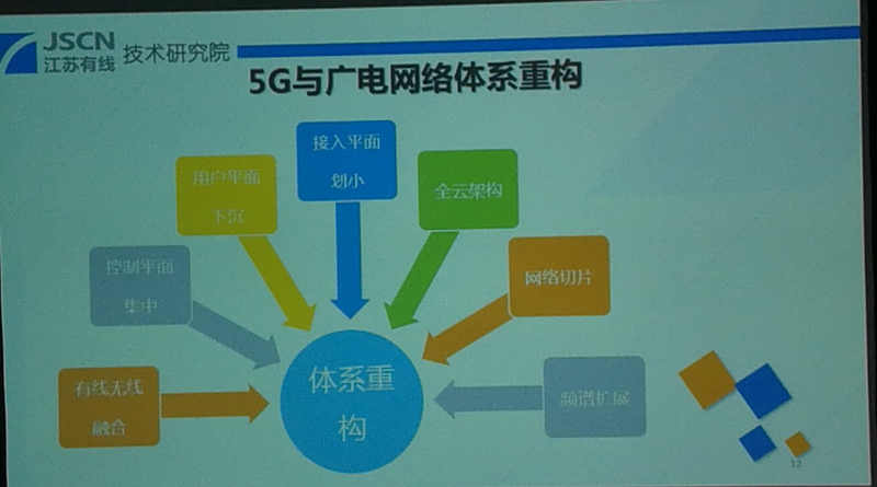 5G的技术对广电网络体系架构的促进和支撑方面,首先是有线、无线的融合,这里主要包括有线、无线在覆盖资源、业务方面的融合。二是控制平面的集中,主要是指实现控制与转发的分离。三是用户平面的下沉,也就是说,把用户平面的内容下沉到边缘,同时将业务流的控制重点在边缘。第四是控制平面的划分效果。第五是全新架构,指的是网络资源和IT资源的云化。第六是网络切变,利用机会针对特定的一些应用场景通过独立的虚拟网络实现承载。第七是频谱拓展,实现超高带宽的应用。