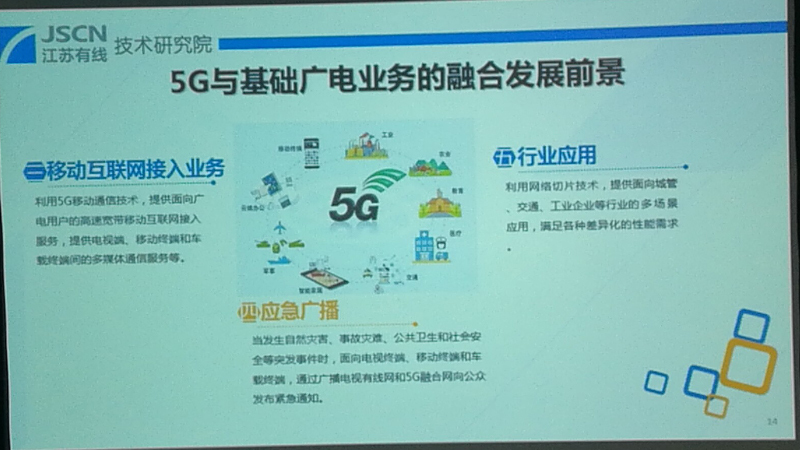 在5G与广电基础业务的融合发展前景方面,这里也列了一些,我这里不详细展开,主要包括基础的直播业务、点播业务、新兴的社会广电业务,面向家庭、户外、车载等常用户场景的传播覆盖。同时,还包括基于有线无线互联网的融合网接入业务,基于5G专用频段的行业应用,这里只是列举了其中一部分,还有一些更多的业务场景可以供大家一起来发掘。