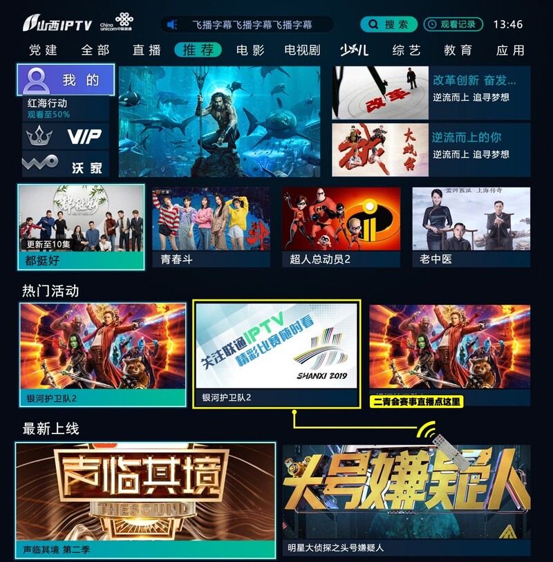 山西联通IPTV关注赛事直播动态,在推荐首页和二青专区内用飞播字幕滚动实时提示赛事信息,精彩内容不容错过!