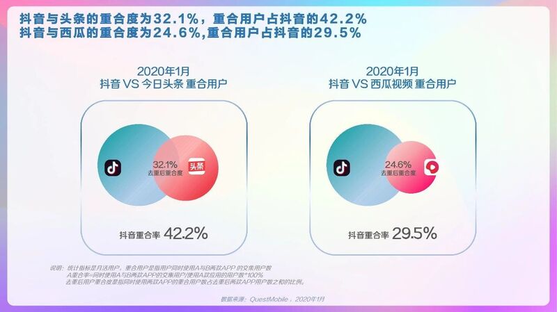 抖音DAU超4亿,较去年同期的2.5亿,增长了60%。抖音与头条的重合度为32.1%,重合用户占抖音的42.2%。抖音与西瓜的重合度为24.6%,重合用户占抖音的29.5%。抖音10-19次占比领先,30分钟以上时长占比提高到38%。