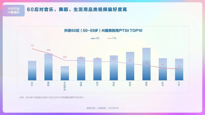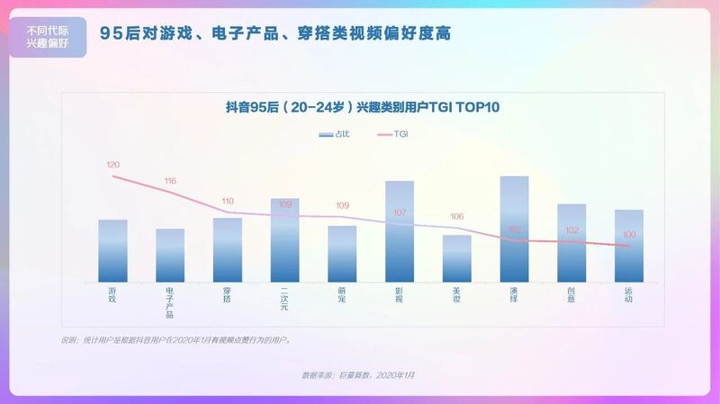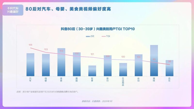 抖音用户偏好视频类型,演绎、生活、美食类视频播放量较高,观看情感、文化、影视类视频增长较快。男性用户对军事、游戏、汽车偏好度较高,女性用户对美妆、母婴、穿搭偏好度高。00后对游戏、电子产品、时尚穿搭类视频偏好度高。95后对游戏、电子产品、穿搭类视频偏好度高。90后对影视、母婴、美食类视频偏好度高。80后对汽车、母婴、美食类视频偏好度高。