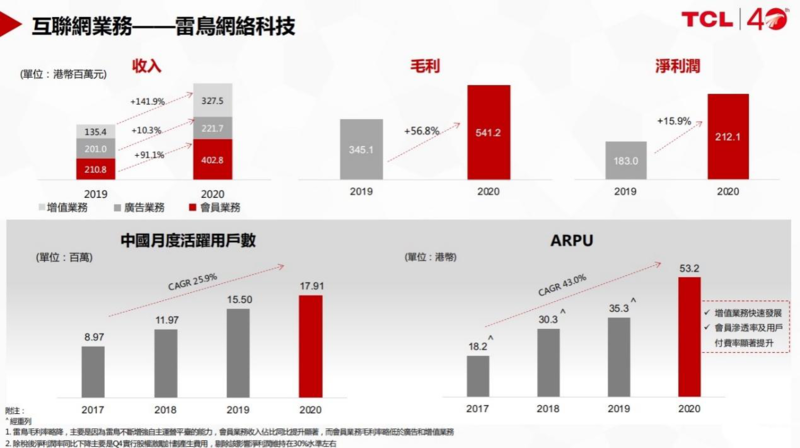 从这个角度来审视雷鸟科技,其2020年9.5亿港元的年收入中,会员业务收入同比增长91.1%,增值业务收入同比增长141.9%,交出了一份亮眼的成绩单。