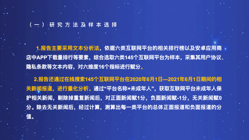 报告主要采⽤⽂本分析法,依据六类互联⽹平台的相关排⾏榜以及安卓应⽤商店中APP下载量排⾏等要素,综合选取六类145个互联⽹平台为样本,采集其⽤户协议、隐私条款等⽂本内容,对六维度16个指标进⾏赋分。