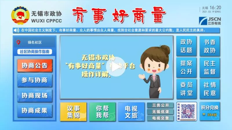 2020年,江苏有线无锡分公司以政协系统落实习近平总书记“有事好商量、众人的事情由众人商量”要求为契机,为无锡市政协搭建“有事好商量”电视平台,在无锡全市1168个社区(村)建立“市、区、街道、社区”四级传播网格,让每个用户可以向社区(村委)和政协建言献策,成为政协基层协商和社区协商的平台。该平台让“有事商量着办”的协商文化在基层孕育发展、生动实践,为推动社会主义协商民主探索新路子,为加强基层治理体系和治理能力现代化拓展了新渠道。平台还获得了省政协2020年度“最佳创新案例”第一名。