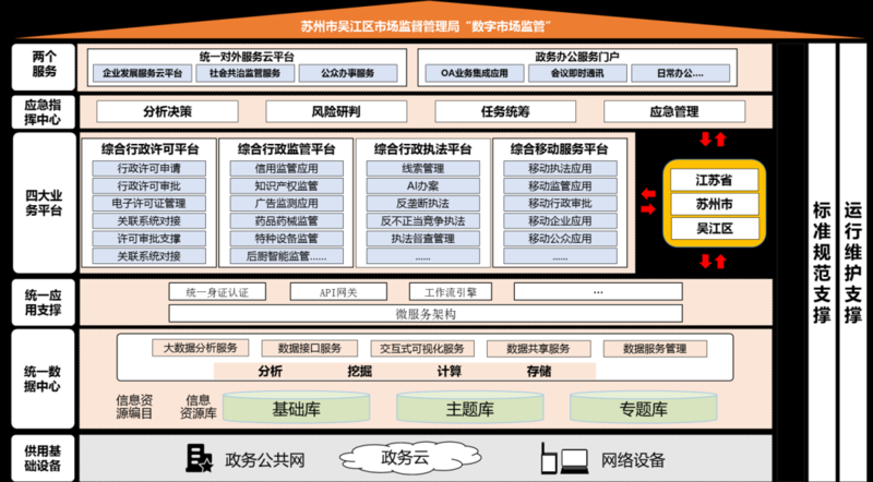 江苏有线吴江分公司从2015年参与市场监督业务,深耕6年来,紧贴吴江区市场监督管理局的数字化业务需求,量身打造具有地方特色的区县级数字市场监管样板平台“数字市场监督管理信息体系”。该项目是“数字吴江”建设的重要组成部分,规划建设“2+2+1+4”的总体架构,即2大服务(统一对外服务云平台,政务办公服务门户)、2大中心(区级市场监管大数据中心、区镇两级综合应急指挥调度中心)、1个统一应用支撑、4大业务平台(综合行政许可平台、综合行政监平台管、综合行政执法平台、综合统一移动平台),是一个基于物联网、大数据及人工智能等技术于一体的综合信息平台。