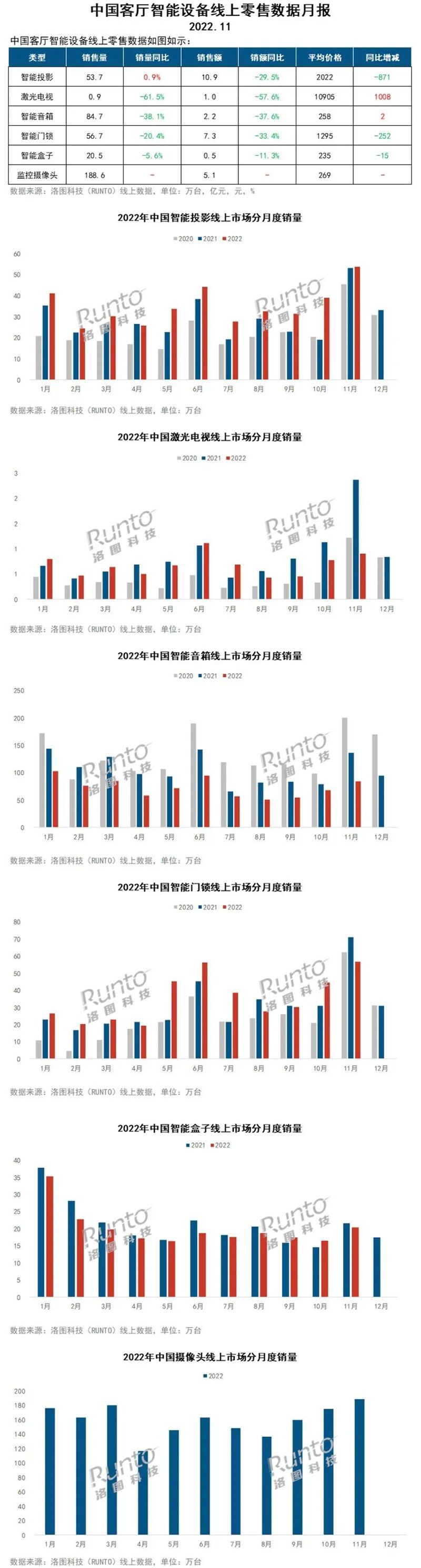 根据洛图科技(RUNTO)线上数据显示,2022年11月,智能投影、激光电视、智能音箱、智能门锁、智能盒子、监控摄像头等六大客厅智能设备总零售量为405万台,总零售额达26.9亿元。在双11大促的刺激下,智能投影、智能门锁和监控摄像头这三类娱乐影音和家庭安防设备销量达到本年度最高值;但从同比来看,除智能投影微增外,其他品类销量同比均出现不同程度的下滑。