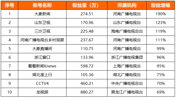 快手平台百万级以上粉丝量的头肩部账号河南广电大象新闻、河南广播电视台乡村观察,山东广电山东卫视,海南广电三沙卫视快手号粉丝量增幅翻倍。