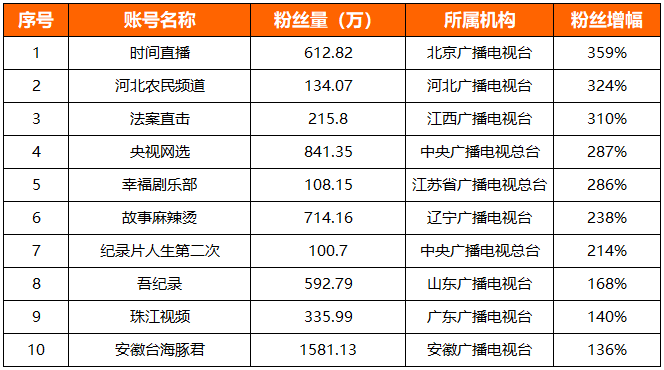 抖音平台百万级以上粉丝量的头肩部账号依然保持高速涨粉趋势,131个百万级粉丝量账号粉丝量增幅超过均值,其中18个账号粉丝量增幅实现翻倍,北京广电时间直播、河北广电河北农民频道、江西广电法案直击抖音号粉丝量较年初增长超过三倍。