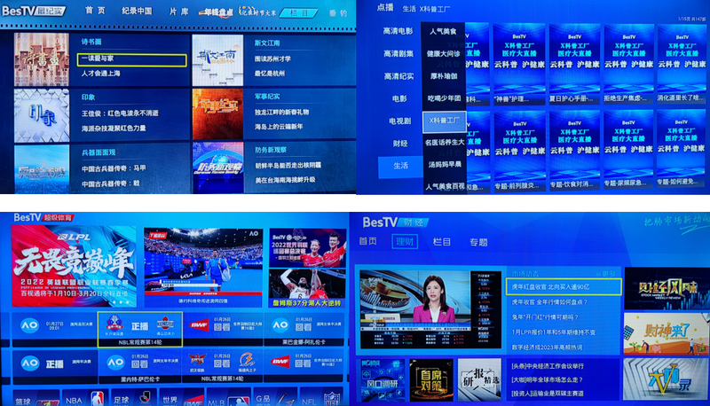 底色是科技蓝,除了文字类的栏目名称,主要以横版、竖版海报为各类内容导航及入口,而春节期间首页及重点专题的中国红,证明该平台有日常运营及维护。以实际体验看,笔者时隔3天所见的EPG首页推荐内容全面进行了更新。