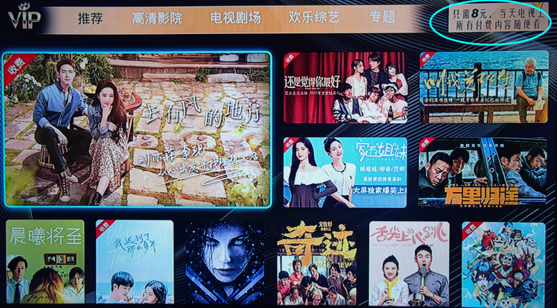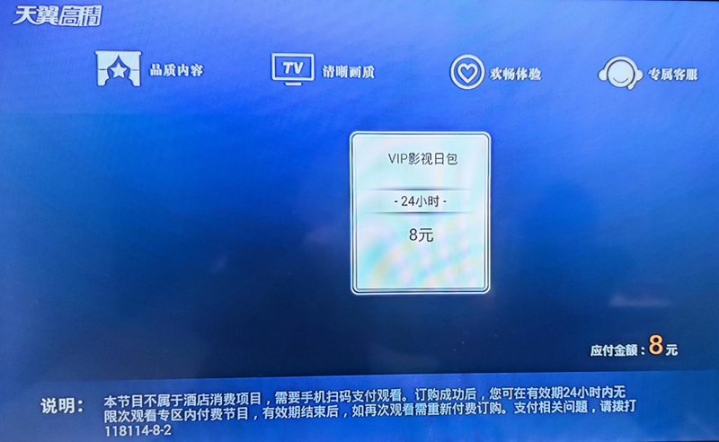 而这两家酒店里江苏电信IPTV的“VIP精品”栏目引起笔者注意的重点还不是其内容,而是收费模式,这些内容被打包成“VIP影视日包”,价格8元,24小时有效,有且仅有这一个收费包,既清晰明了,也非常适合酒店的消费场景。