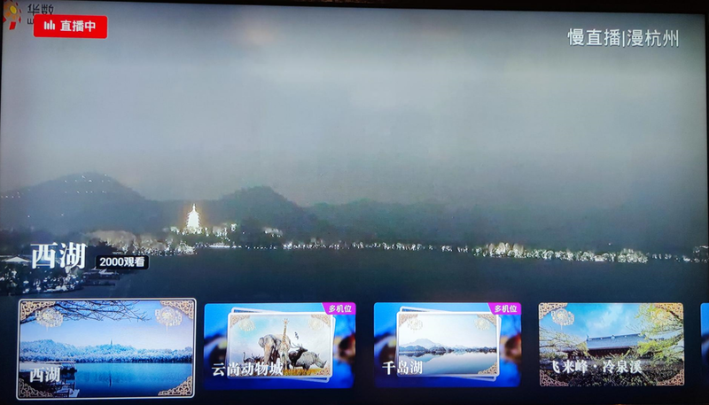 此外,玉泉饭店的互动电视还多出了一个很有趣的内容版块——慢直播|漫杭州,24小时直播西湖、云尚动物城、千岛湖、飞来峰冷泉溪、建德、桐庐、临安、西溪湿地、大运河等多处景点,有些景点还是多机位直播。非常适合旅行的人们观看。