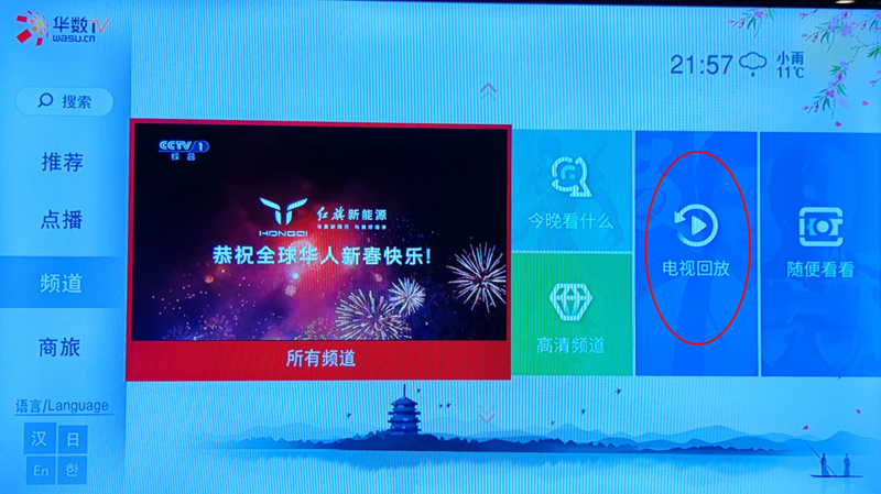 华数互动电视提供14天的回看,在三个酒店里,虽然界面和内容都有所不同,但回放都是一个独立的频道。其中,玉泉饭店的回放频道点进去相对简单,就是将能回放的频道做了分类,进入具体频道有时间轴。而机场酒店则不但在直播频道有“今晚看什么”“随便看看”这样给不知道看啥的用户的贴心指引,还提供回放搜索,可以说十分之贴心了。遗憾的是,体验到一半,该酒店的电视突然卡在某个界面不动,重启等无效,没能进一步发掘。