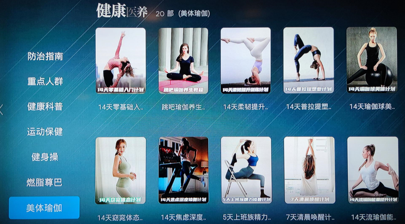浙大边上的玉泉饭店,其互动电视的电影、电视剧、综艺、电竞、纪录等栏目与机场酒店相同,但体育、少儿等栏目从子栏目设置等方面与其有所不同。“体育”栏目中没有中式八球,但有西甲和“栏目”栏目;少儿页面没有联动直播频道,也不如机场酒店栏目多。另外,玉泉饭店的内容多出了一个“健康医养”栏目,有疫情相关的权威解读、防治指南、重点人群等,也有健康科普、运动保健、美体瑜伽等等。