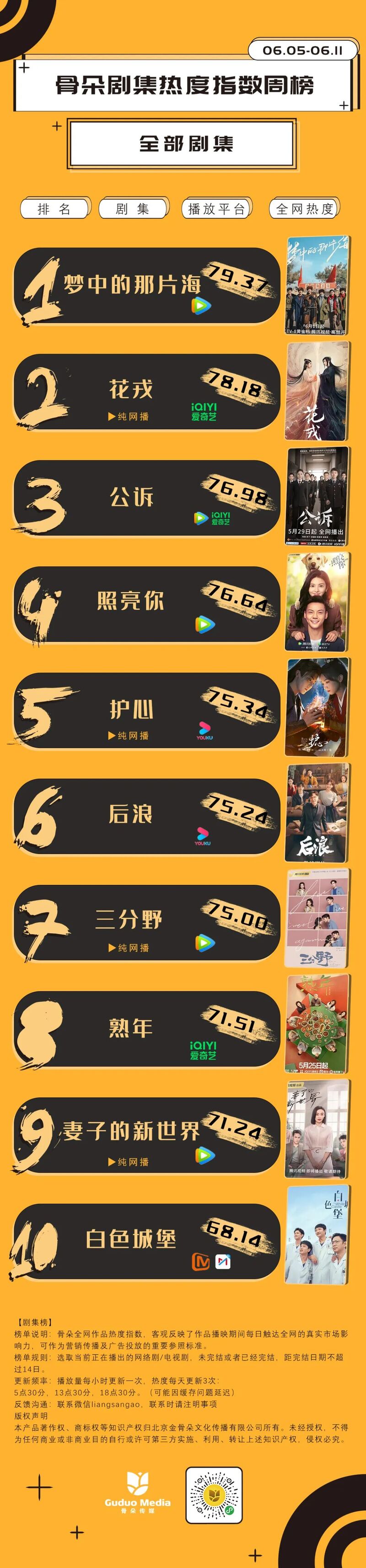 《梦中的那片海》上线11天,全网热度79.37,强势登顶周榜。同期上线的《花戎》紧随其后,位列榜单第二。《公诉》排名第三。另一上新剧《照亮你》则以全网热度76.64热度占据榜单第四的位置。