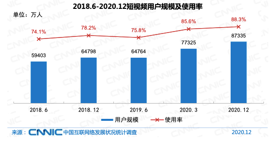 第47次《中国互联网络发展状况统计报告》显示,截至2020年12月,中国网络视频用户规模达9.27亿,其中短视频用户规模为8.73亿,占网民整体的88.3%。在这股潮水下,B站推出了竖屏模式的Story-Mode,开始为平台的短视频发展铺路。