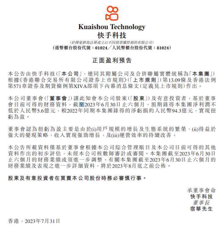 快手刚刚发布了一则盈利预告,预计今年上半年集团净利润将不低于人民币5.6亿元。