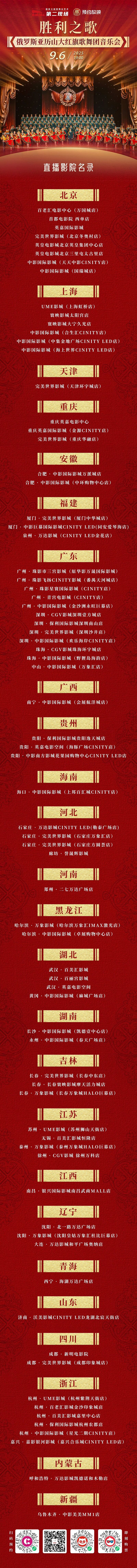 为纪念中国人民抗日战争暨世界反法西斯战争胜利80周年,在北京市委宣传部、北京市广电局的指导下,由国家大剧院主办,中国电影产业集团股份有限公司、中联超清(北京)科技有限公司协办,9月6日19:00,超高清“第二现场”俄罗斯亚历山大红旗歌舞团“胜利之歌”音乐会将在国家大剧院歌剧院隆重上演,以顶尖演出阵容致敬历史、礼赞和平。