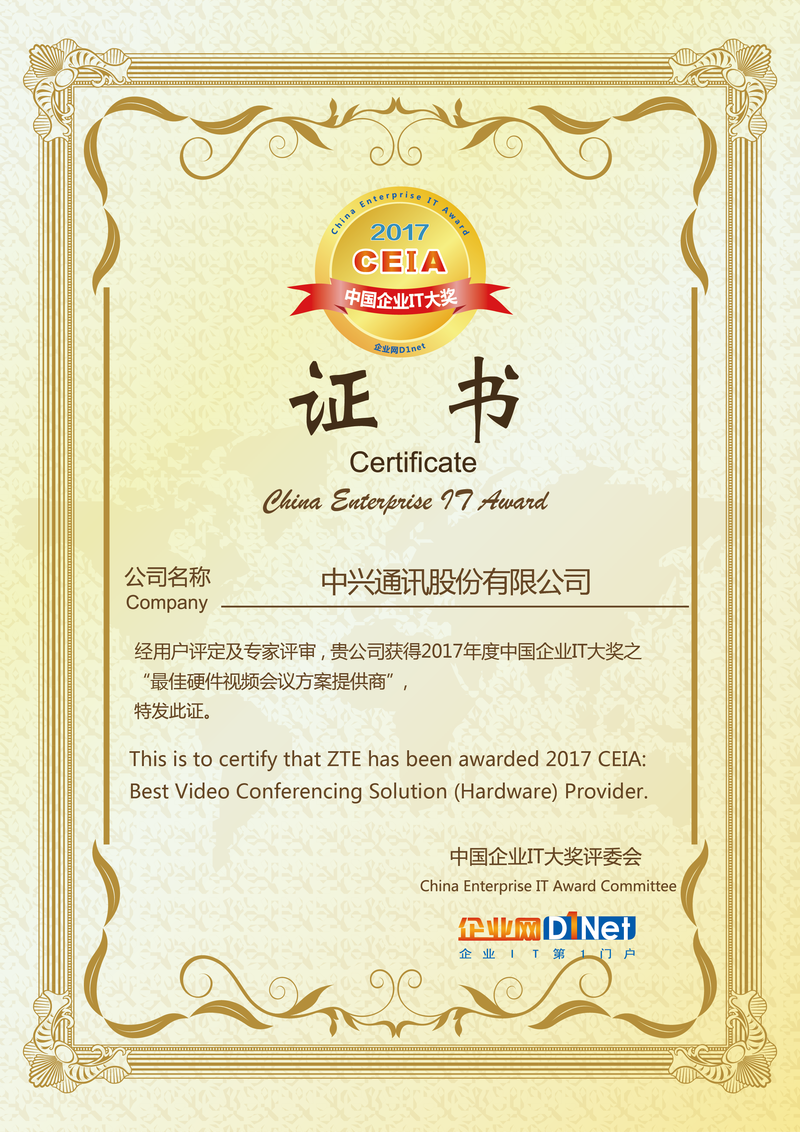 1月15日,2017CEIA中国企业IT大奖正式揭晓。经过首轮数万名读者网络投票和第二轮150余位业界信息主管、企业高管和资深专家共同组成的CEIA评委会的严格评选,中兴通讯凭借其在视频会议领域领先的解决方案及服务能力,在诸多厂商中脱颖而出,摘得2017 CEIA“最佳硬件视频会议方案提供商”大奖。