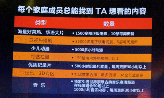 内容和服务方面:联合华数传媒、未来电视等牌照方资源搭建32万小时在线视频资源,号称国内最大智能电视合法合规视频资源库——包含35000集正版电视剧、覆盖40个卫视黄金档剧集;1500多部正版电影,囊括美国6大影片公司当年度全部新片;5000小时绿色少儿动漫;热播综艺栏目150档以上。除此之外还有优质纪录片,独家引进的世界顶级古典音乐高清频道。