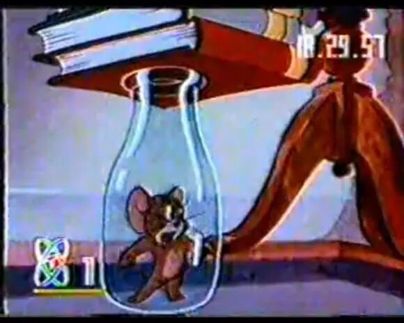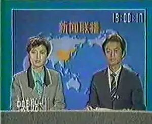 1991年左右,央视悬挂台标第一次调整:右上角的方形报时器不变,左下角悬挂上了经典的双线蝴蝶标,不过仍然是只有每到半点的时候才悬挂。