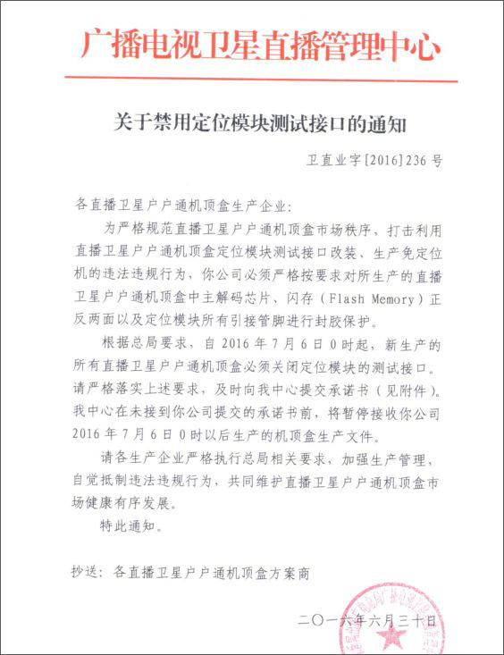 7月初,发出通知,要求直播卫星户户通机顶盒厂家关闭定位模块测试接口并对所有引接管脚进行封胶保护。
