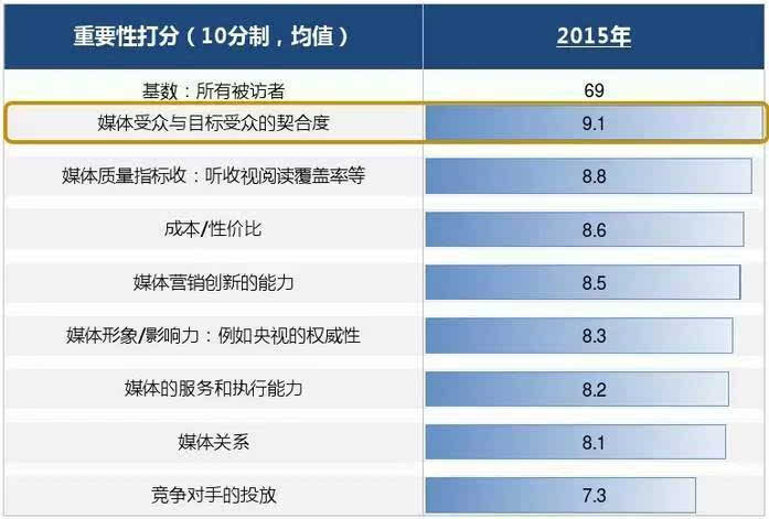 根据CTR的《2015年广告主广告营销调查报告》,广告主在投放媒体时,最看重的指标包括以下几类: