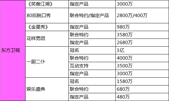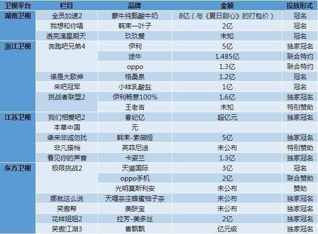 从上表中可以看到,品牌们的大额广告资金还是涌向了湖南卫视、浙江卫视、江苏卫视、东方卫视四大一线卫视的强势节目。