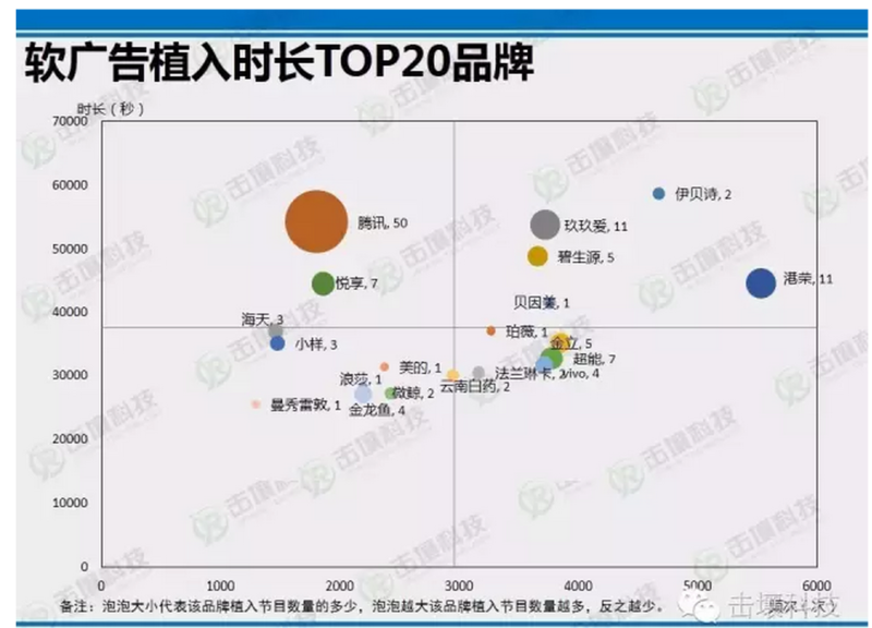 3、 在软广告植入时长方面,玖玖爱、海天等品牌投放时长增长幅度较大,带动了食品行业植入时长的大幅度提升;商业及服务性行业由于定制化节目植入时长大幅度上升,在广告市场形式较差的情况下,提供了吸引新客户的新思路。