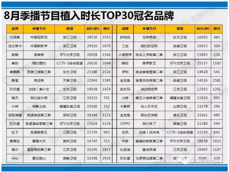 贝因美冠名的《中国冠军范》播放频率较高,在8月份植入时长最长,达到38530秒,超过第二名的法兰琳卡投放的《中国新歌声》冠名植入时长9014秒。玖玖爱冠名的三挡节目进入了8月冠名时长TOP30,累计冠名时间达到46606秒。