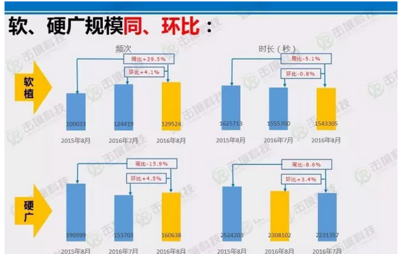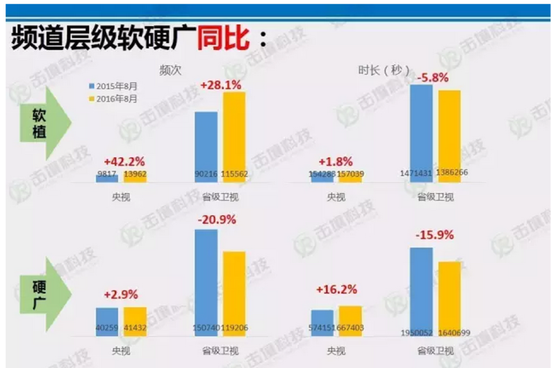 总体上来看,软、硬广的时长分别有5.1%和8.6%的下跌。广告市场环境与去年相比呈现下降态势。