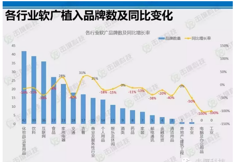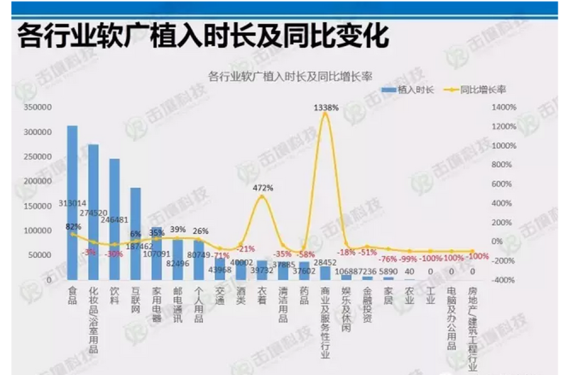 食品行业软广植入时长同比猛增82%,商业及服务性行业软广植入时长同比暴涨13倍