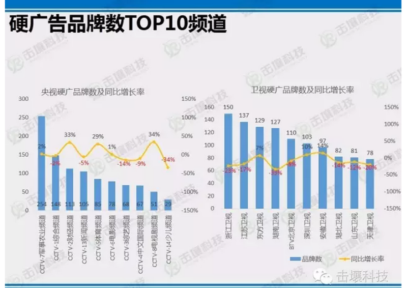 央视的硬广品牌数量中,CCTV-7军事农业频道仍然独占鳌头,拥有254个硬广品牌;CCTV-8电视剧频道品牌数量同比涨幅最高,达到34%。