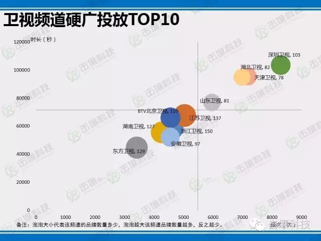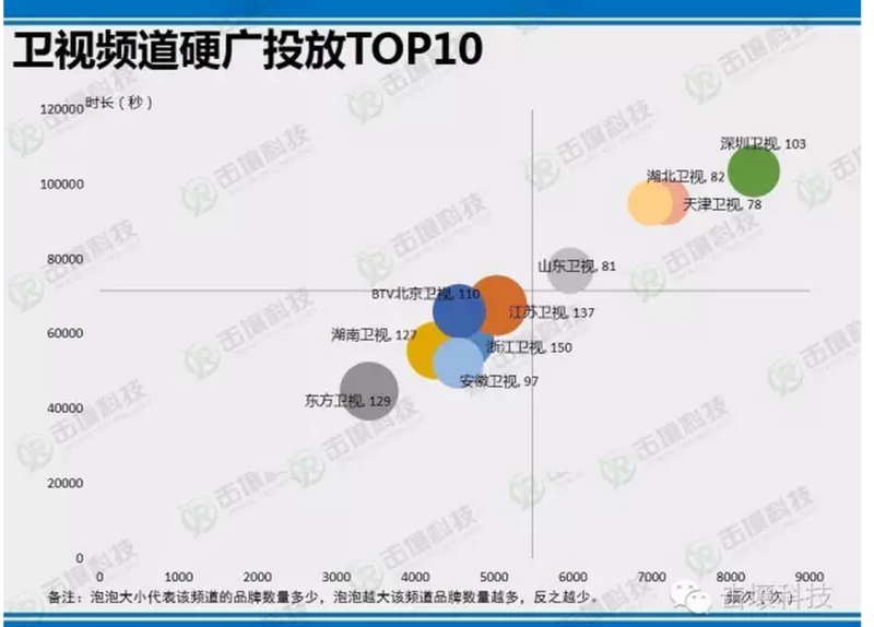 硬广方面,一线卫视客户数量较多,硬广饱和度大致相同。深圳卫视植入时长频次最高。