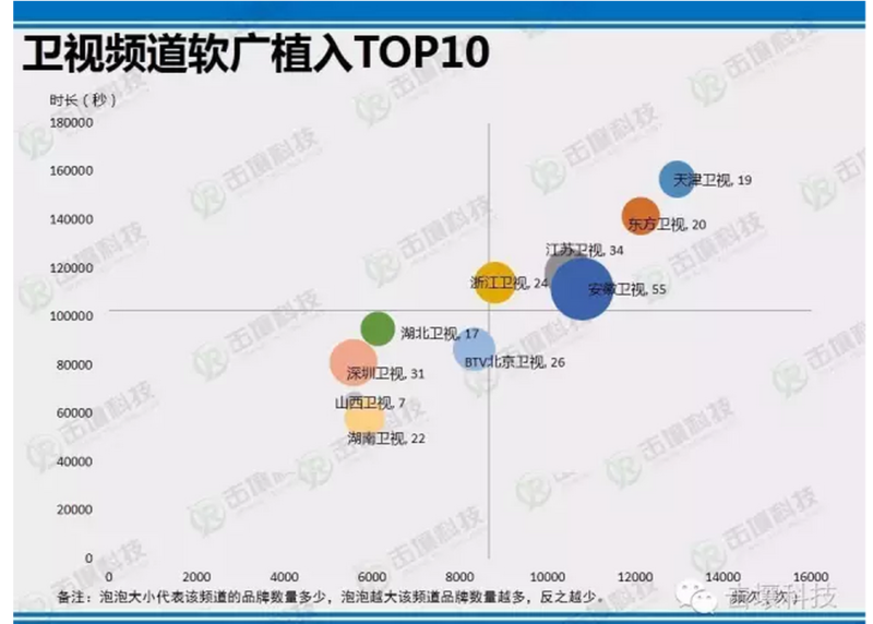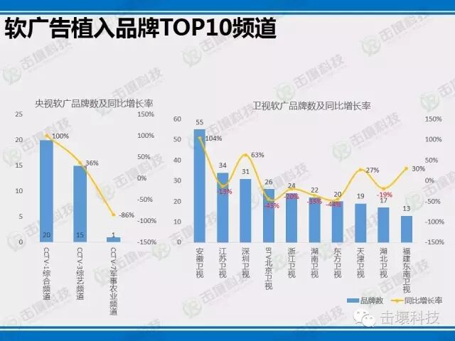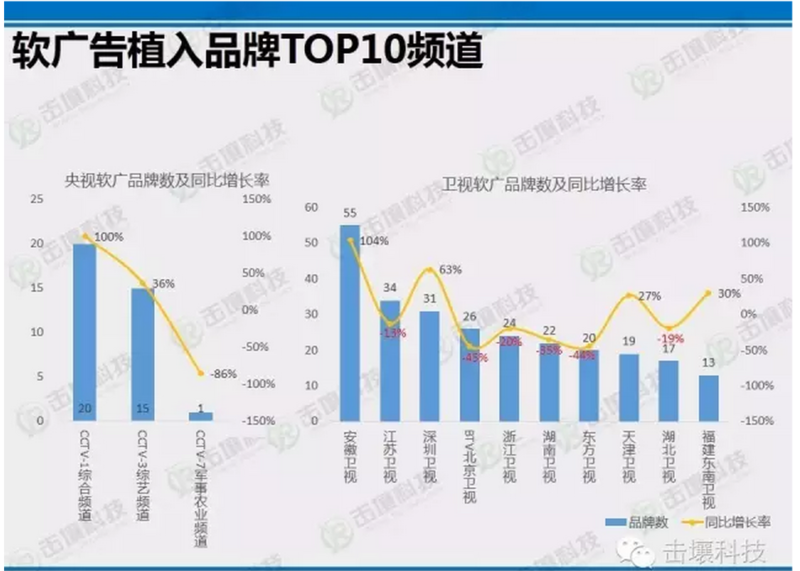 在央视中,CCTV-1综合频道软广品牌数量同比去年品牌数量翻了一倍;CCTV-3综艺频道软广品牌数量同比增长36%;CCTV-7军事农业频道软广品牌数量下降86%,仅剩一个品牌有软广告植入。