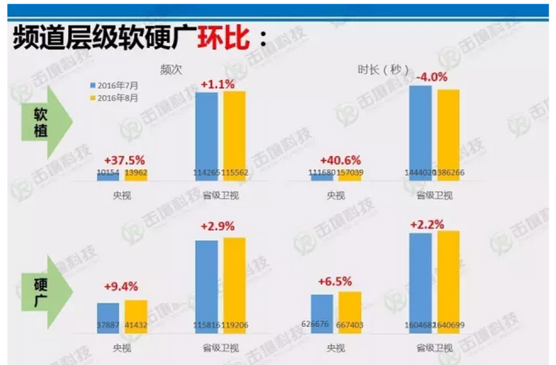 硬广相比上个月走势较好。央视同环比增长幅度高于省级卫视。