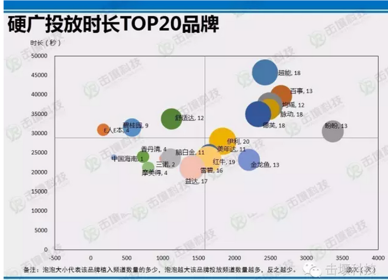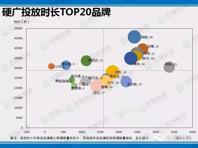 在硬广投放时长TOP20中,超能硬广时长最长,盼盼的硬广投放频次最高。