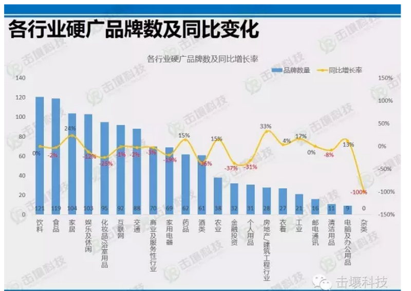 除家居行业品牌数量同比增长24%外,硬广品牌数较多的行业品牌数量普遍减少。而硬广品牌数量少的行业同比数量普遍有所增长。