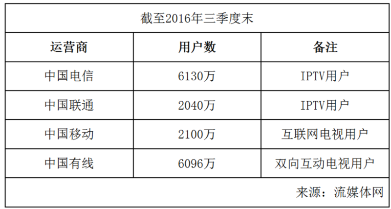 据流媒体网统计,截止2016年三季度末,中国电信的IPTV用户数突破6100万,中国联通IPTV用户突破2000万,中国移动的互联网电视用户达到2100万。三大运营商的电视业务(IPTV+互联网电视)已经突破一个亿的用户规模。同期的有线网络的双向数字电视用户,为6096万(国网报告),已低于中国电信的IPTV 用户数。
